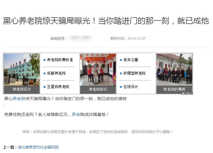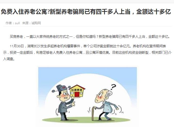 小编点开了第一条和第二条搜索结果,基本牛头不对马嘴,并没有讲解什么骗局之类的东西。接着我们看第三条搜索结果,这一条新闻主要是讲解湖南某些养老机构以免费入住的形式行骗,养老机构在宣传期间表示,投资一定金额后,利息足够老人免费入住养老公寓,下面是本条新闻的截图。