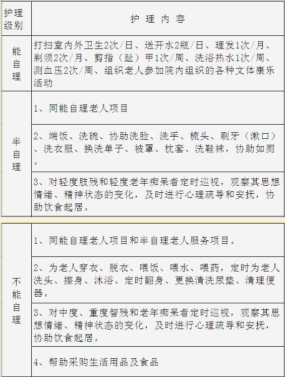 公寓为以优美的环境和亲人般的关爱为老年人提供度假疗养、生活护理、医疗、康复训练、养生保健等服务,可根据入住需求提供从日托到长期疗养等服务,生活护理项目如下: