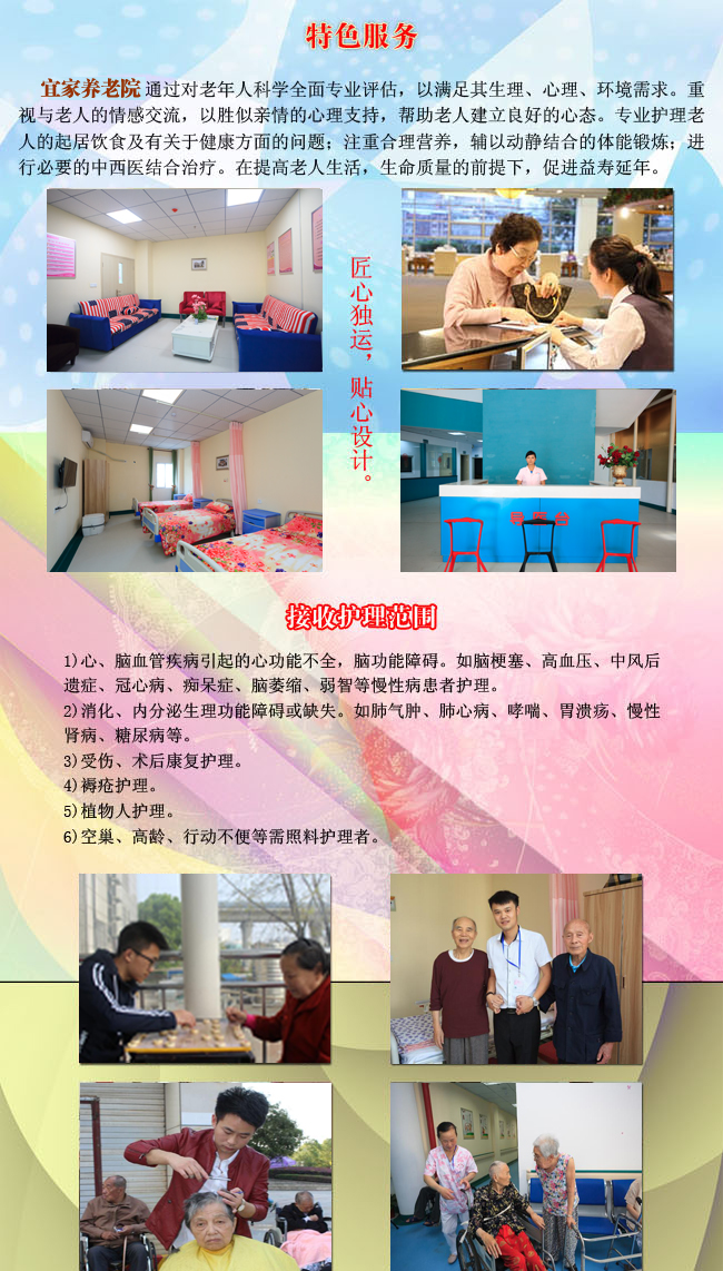 对老人的服务和关爱从心做起,关心老人、爱护老人、尊重老人,帮助老人恢复躯体机能,体现自身价值。上为政府分忧,下帮儿女尽孝,愿老人长寿而快乐的生活,为创办一座以养为主、24小时负责为老人的健康状况、饮食起居、生活照料等全方位服务的一流养老机构而努力奋斗。